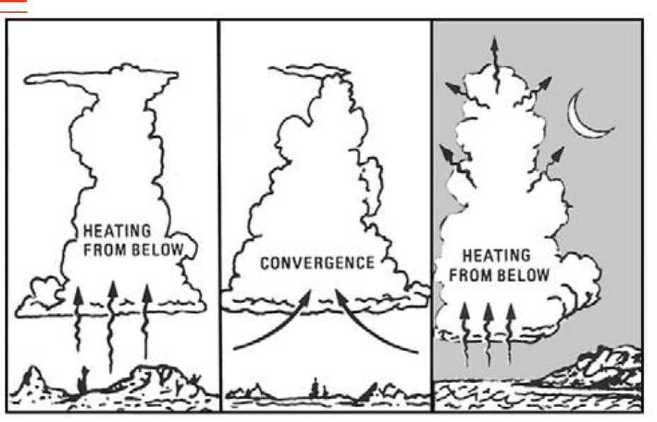 Normally due to heating from below in a moist, unstable, slow moving air mass.