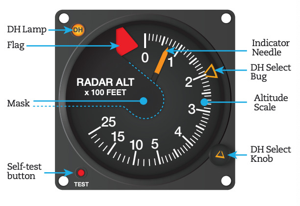 Rotate the knob to select the desired decision height on the altitude scale. The lamp lights when the decision height has been reached. The flag then drops into view indicates that invalid altitude information is being displayed.