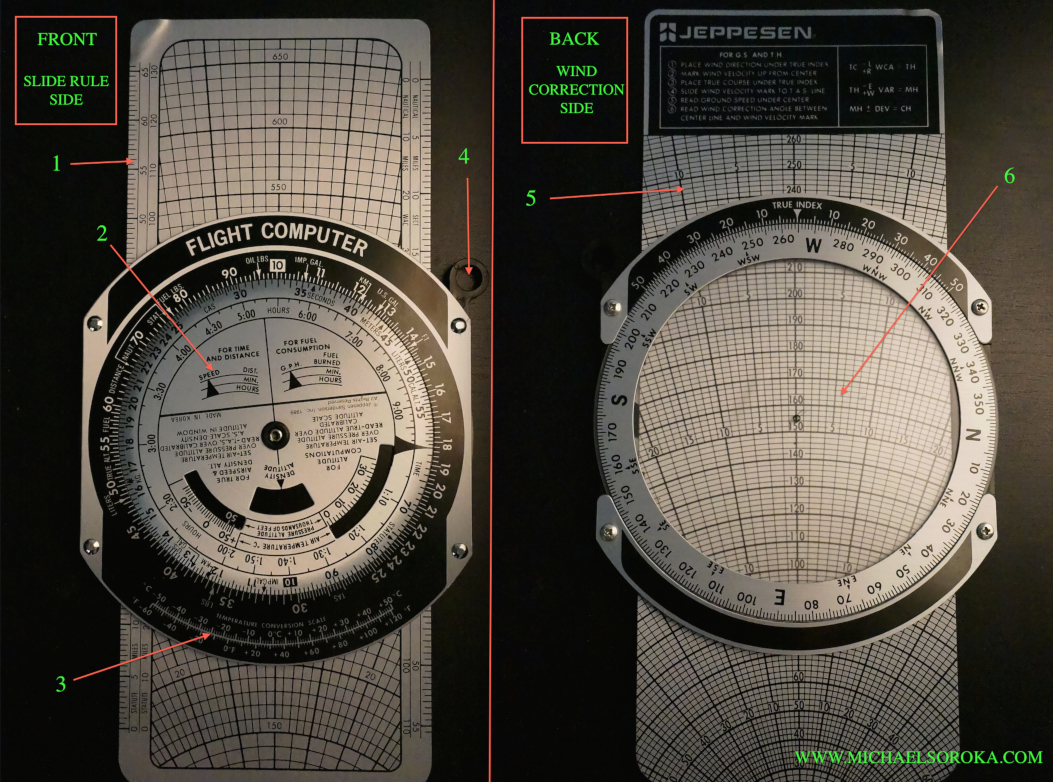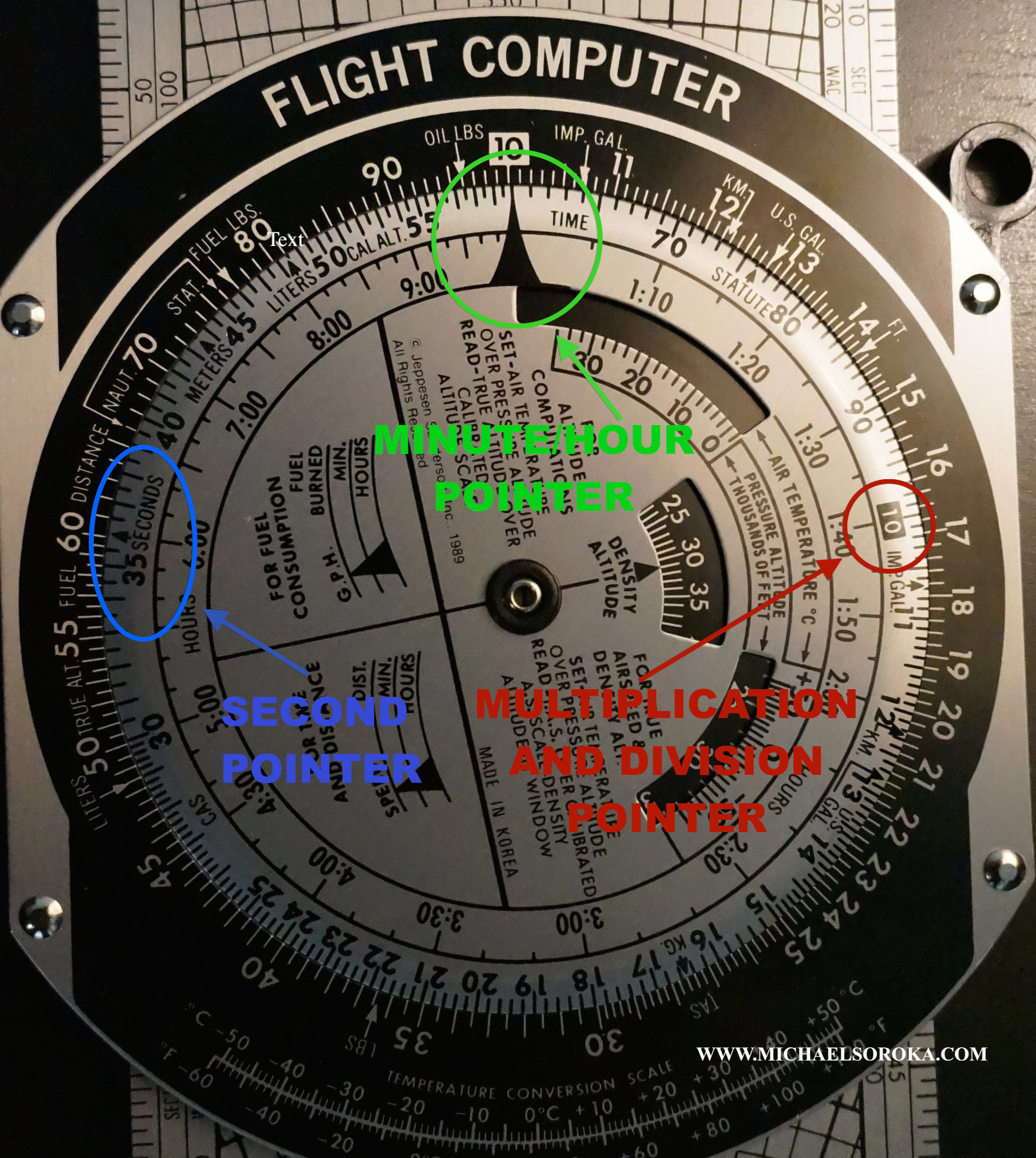 - Minute/Hour pointer: Most commonly used poitner on the E6B. Allows you to work in minutes and hours to do anything in base 60.