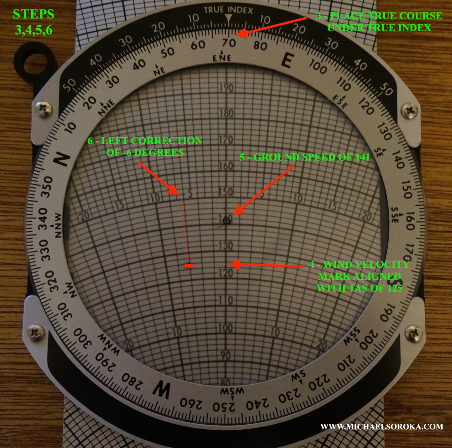 Second rotation: 3. 70: Rotate top to your true course (70) under true index 4. 125: Slide the “pencil mark” to your air speed 5. 141: The ground speed is actually 141kts on the “hole”. 6. Find the wind correction by counting the lines from center line which would be left correction of -6degrees.