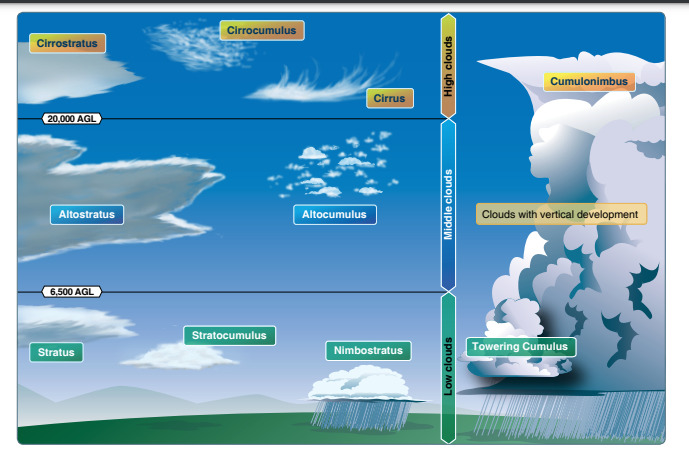 - Cumulus: Forms in rising air currents and evidence of unstable air conditions