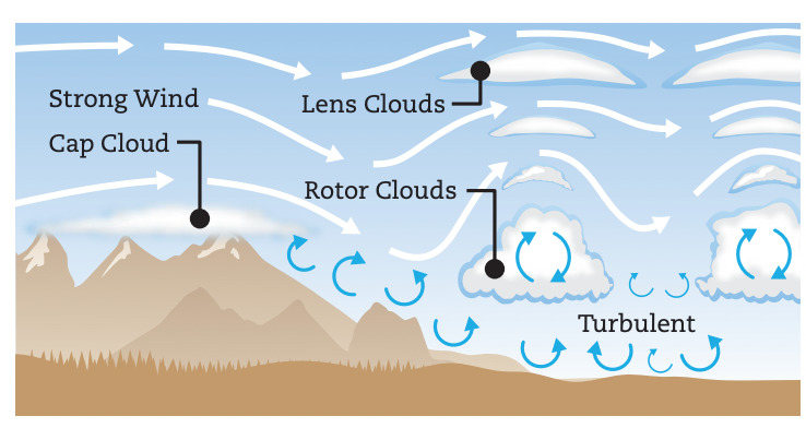 - Turbulence: Cause by friction between the air and ground creating eddies in an up and down motion