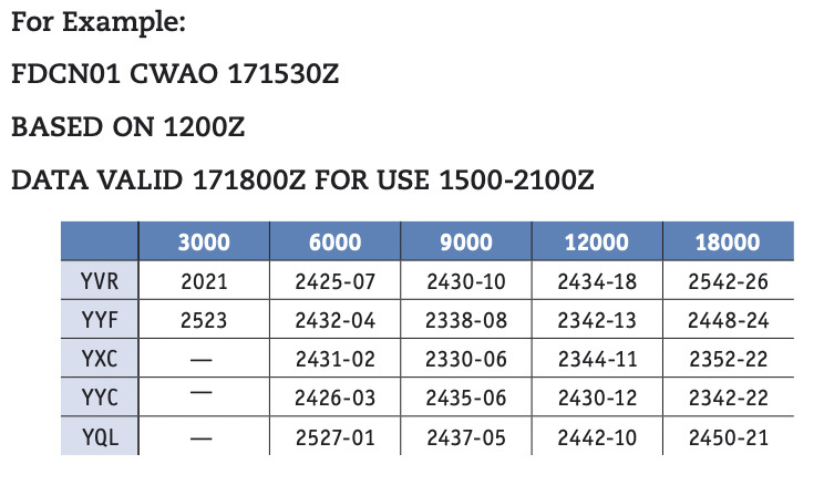 Above example: For YVR @ 600ft it’s wind at 240 at 25knots with temperature at minus -07.